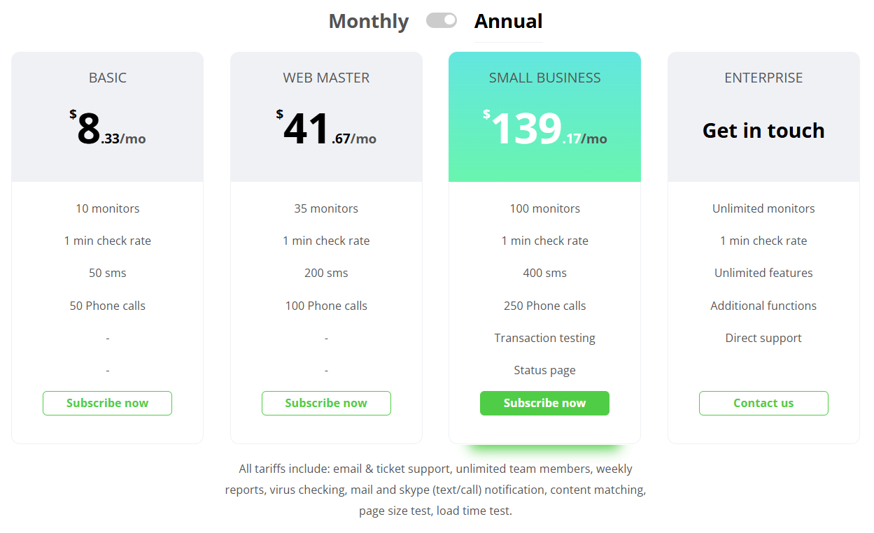 Upgrade to paid for 30-second intervals and advanced features. You can change your tarrif plan any time. Click Pricing ans select your tarrif plan starting from $8.33/mo, click Subscribe now.