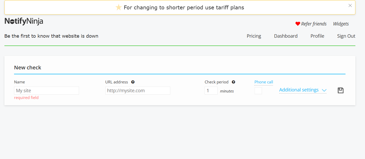 Click Profile, add alert channels like email, Telegram, phone calls, or SMS. Link them to this monitor – NotifyNinja sends alerts in 30-60 seconds on downtime.
