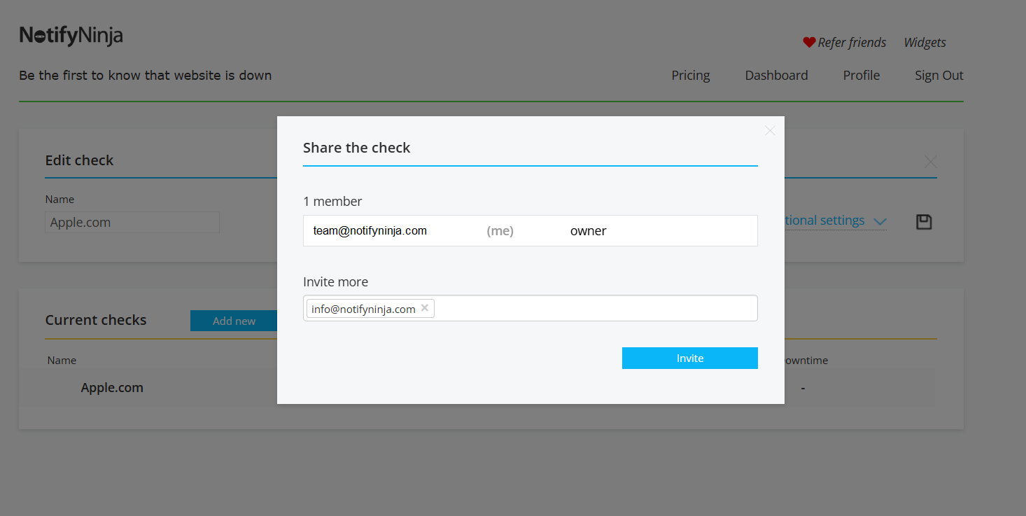 Go to notifyninja.com, click “Try now for free” and sign in with your email and password. You’ll land on the main dashboard showing your active monitors (likely empty if you’re new). You could even invite your team members: click Members, write an email and click Invite.